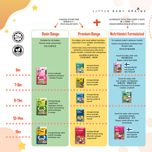 Step 1 Fresh Start 6M+, Step 2 Light & Easy 6M+, Step 3 Junior Nutri-Colour 9M+, Step 4 Nutri-Colour 12M+, Step 5 Q-Junior 15M+ |