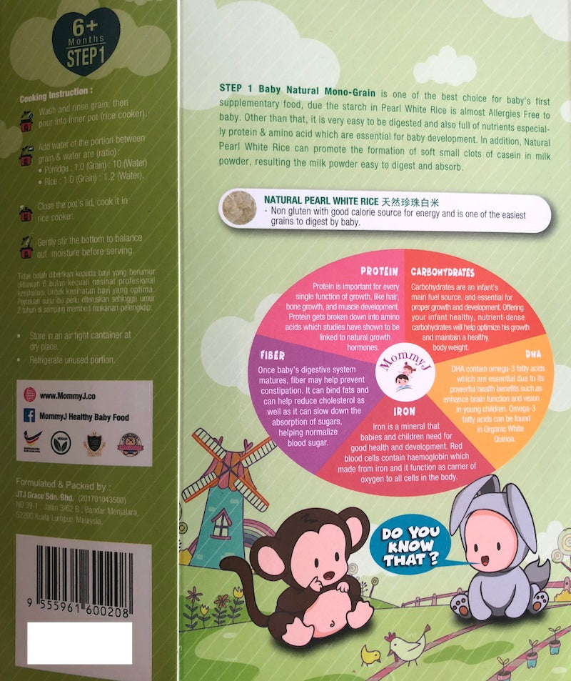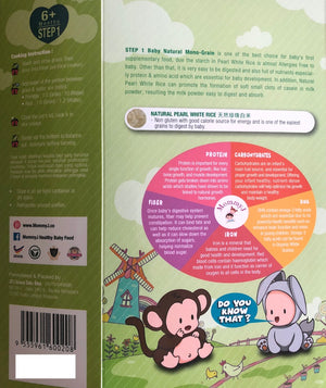 MommyJ Step 1 Mono-Grain contains Natural Pearl White Rice, a great choice for your baby's first supplementary food, especially for babies 6 months and above. The starch in Pearl White Rice is almost allergy-free, making it a safe and healthy option for your baby. Additionally, Pearl White Rice is very easy to digest and is full of nutrients, including protein and amino acids, which are essential for your baby's development.
