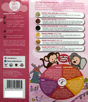 MommyJ Step 4 Multi-Grain is specifically formulated for babies aged 10 months and above, to provide a more complete B complex vitamin, minerals, and useful protein for overall development. At this stage, your little one's digestive system is not yet fully developed, so our specially formulated grains have a softer texture that is produced from milling paddy grains, making it easier for your baby to digest. Step 4 contains a blend of high-quality, organically grown ingredients, including pearl rice, bario black rice, bario red rice, cornmeal, hulled millet, and white quinoa.