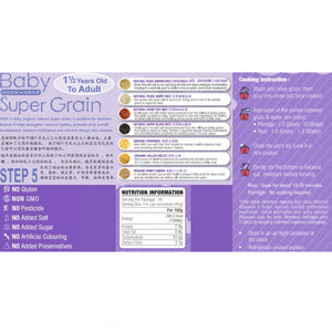MommyJ Step 5 Super-Grain is specifically formulated for toddlers aged 18 months and above. Super-Grain is an excellent choice for toddlers as it helps to strengthen their immune system, promote overall development, improve intelligence, and prevent allergic skin diseases. Step 5 contains a blend of high-quality, natural and organically grown ingredients, including natural pearl brown rice, natural pearl white rice, organically grown bario red rice, organically grown bario black rice, organic cornmeal, organic hulled millet, and organic white quinoa.