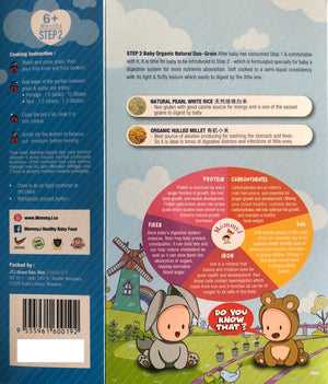 Once your baby is comfortable with Step 1, it is time to introduce them to MommyJ Step 2 Duo-Grain. Step 2 contains a blend of organic pearl rice and organic hulled millet, which are both excellent sources of nutrients for your baby's growth and development.