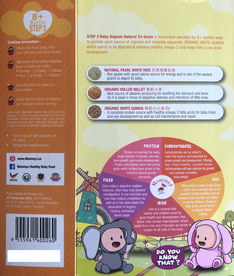 MommyJ Step 3 Tri-Grain is specially formulated for babies aged 8 months and above. It provides a good source of vitamins and minerals, particularly through the inclusion of organic white quinoa, which is easily digested and contains healthy omega-3 fatty acids that support your little one's brain development. Step 3 contains a blend of high-quality, organically grown ingredients, including pearl rice, hulled millet, and white quinoa.