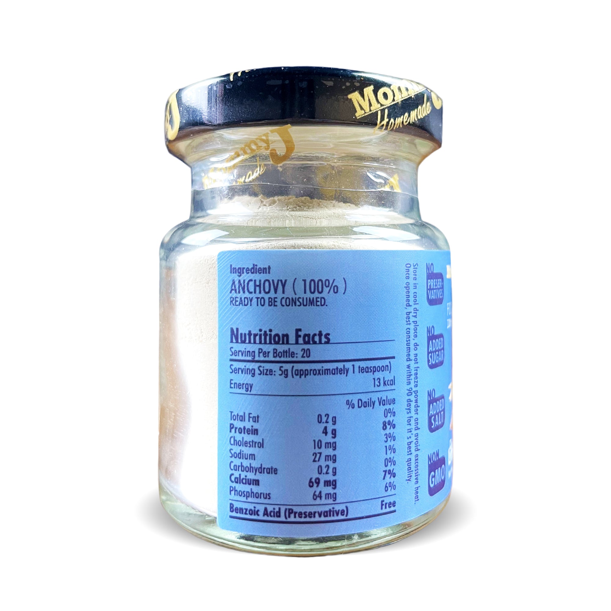 Anchovy is a great source of calcium, which is essential for strong bones and teeth. Additionally, anchovy is rich in omega-3 fatty acids, which help to support brain development and cognitive function. Our premium quality anchovy is carefully selected and processed without head and guts, and blended finely with edible bone for a greater source of calcium.