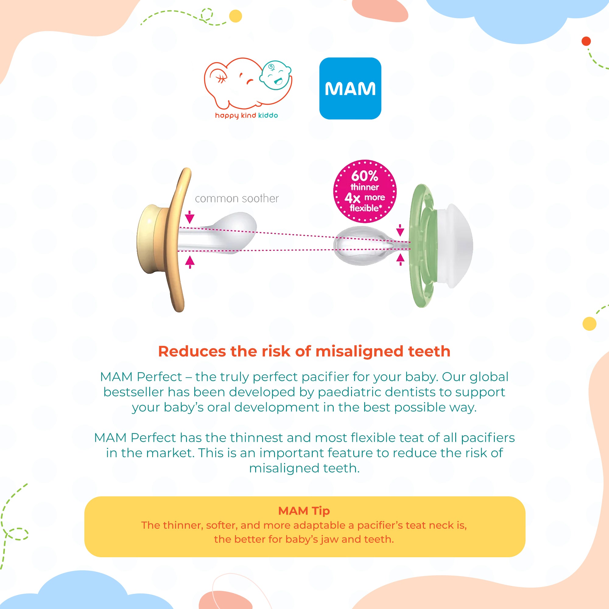 MAM Perfect has the thinnest and most flexible teat of all pacifiers in the market. This is an important feature to reduce the risk of misaligned teeth.