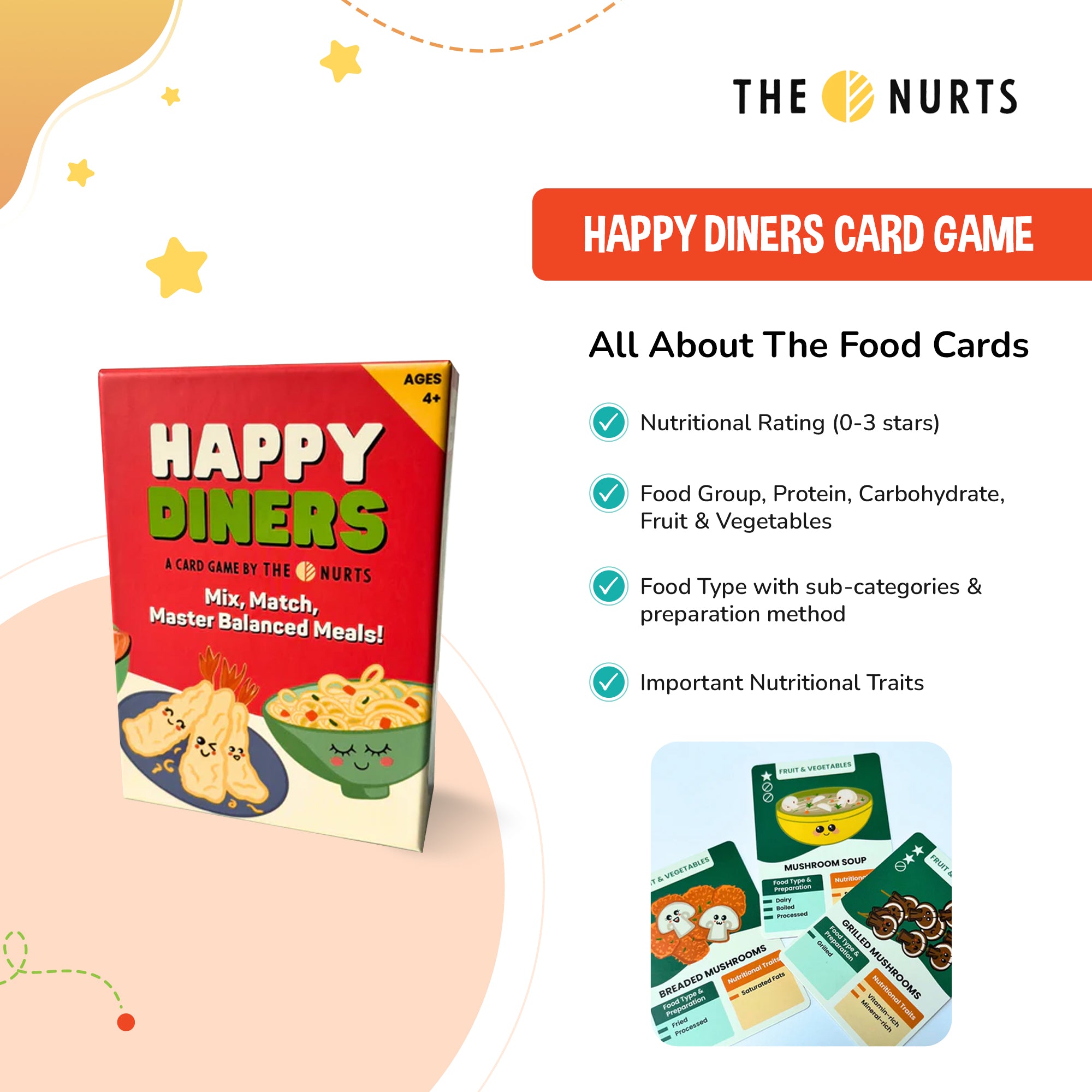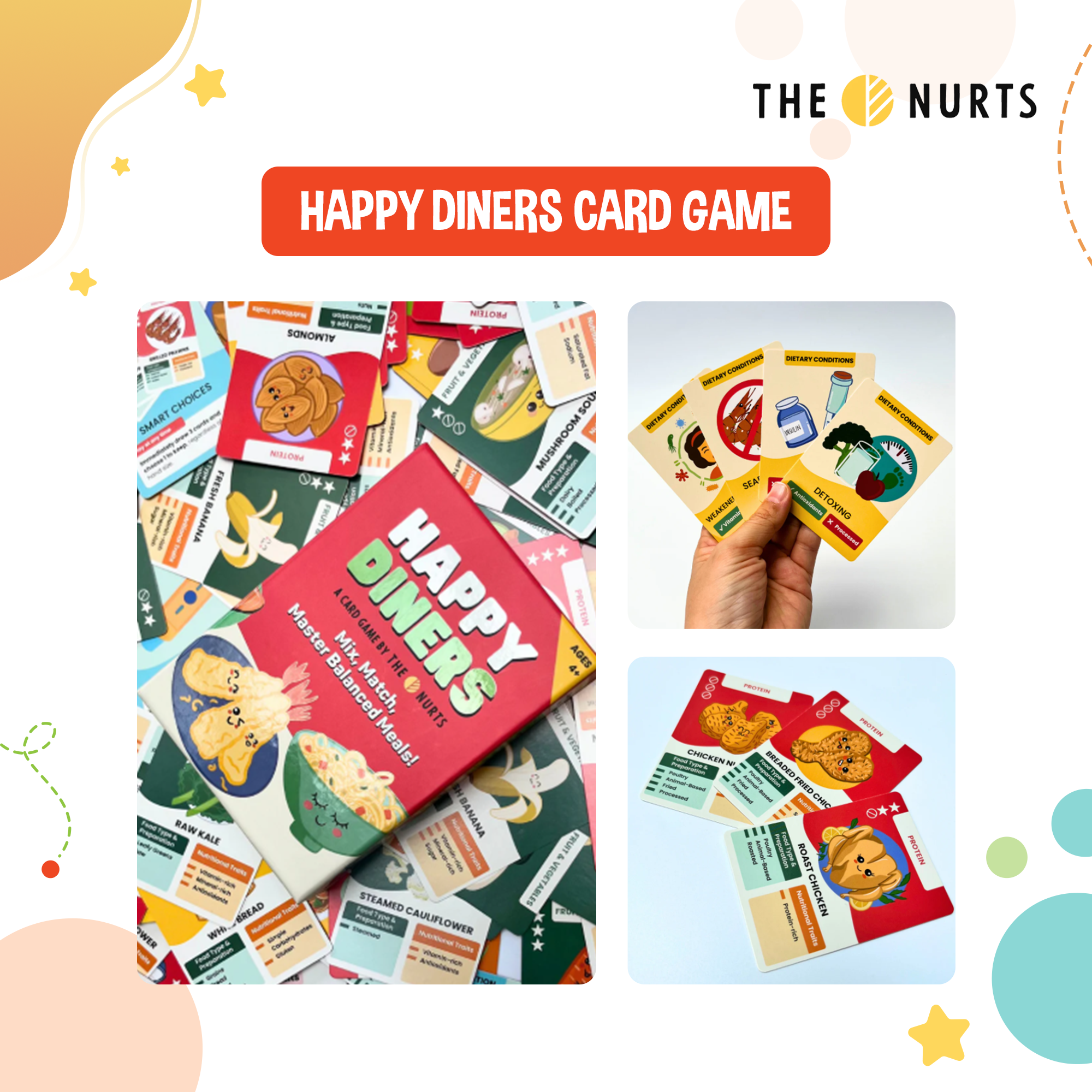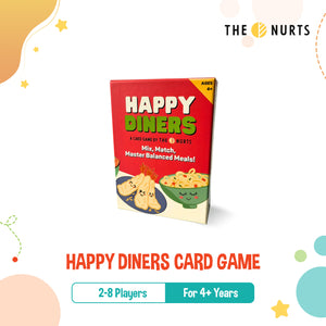 Enter the fun-filled world of Happy Diners with The Nurts HAPPY DINERS Card Game for 4Y+! This exciting game makes learning about balanced meals and nutrition a truly enjoyable experience, without any boring lectures.